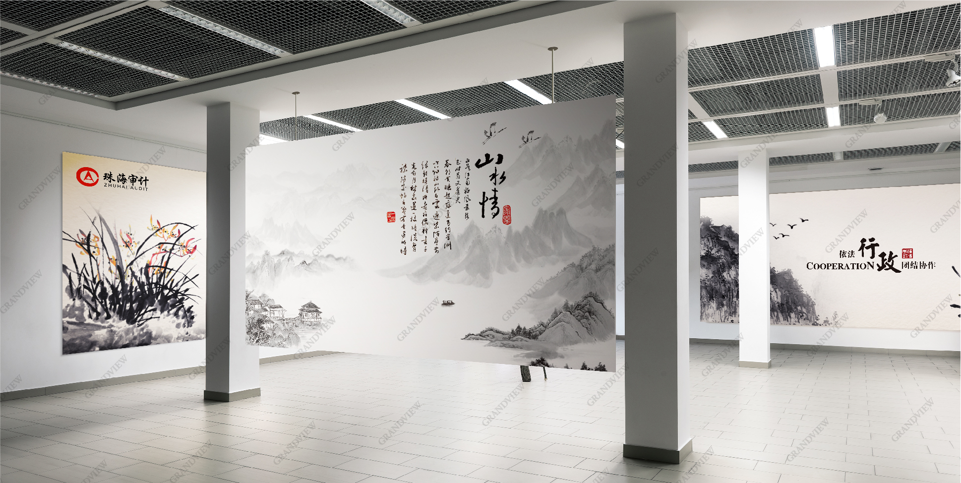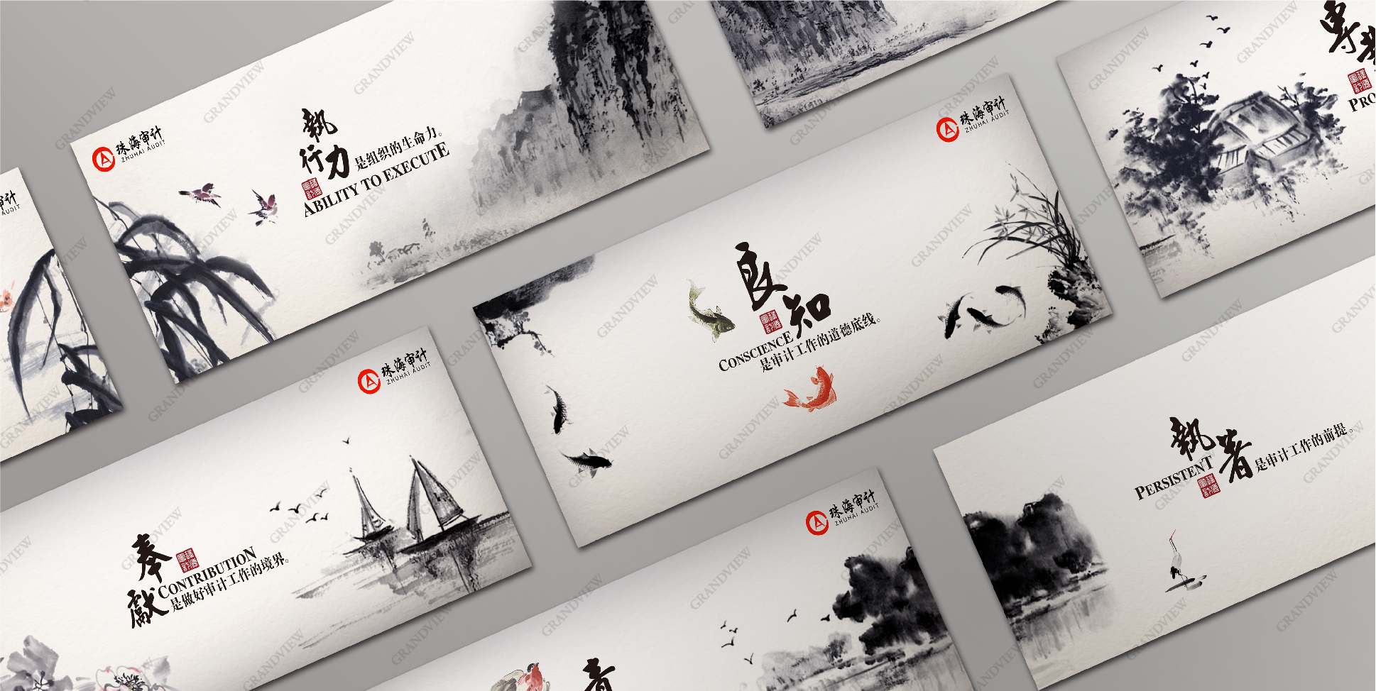 當(dāng)看到一幅極具人文古韻的水墨畫時,為珠海市審計局與藝術(shù)聯(lián)結(jié)點苦苦尋覓無果的廣角設(shè)計師茅塞頓開。于是著力于對民族的審美意識和審美心理的把握,站在珠海市審計局的角度進(jìn)行綜合設(shè)計。