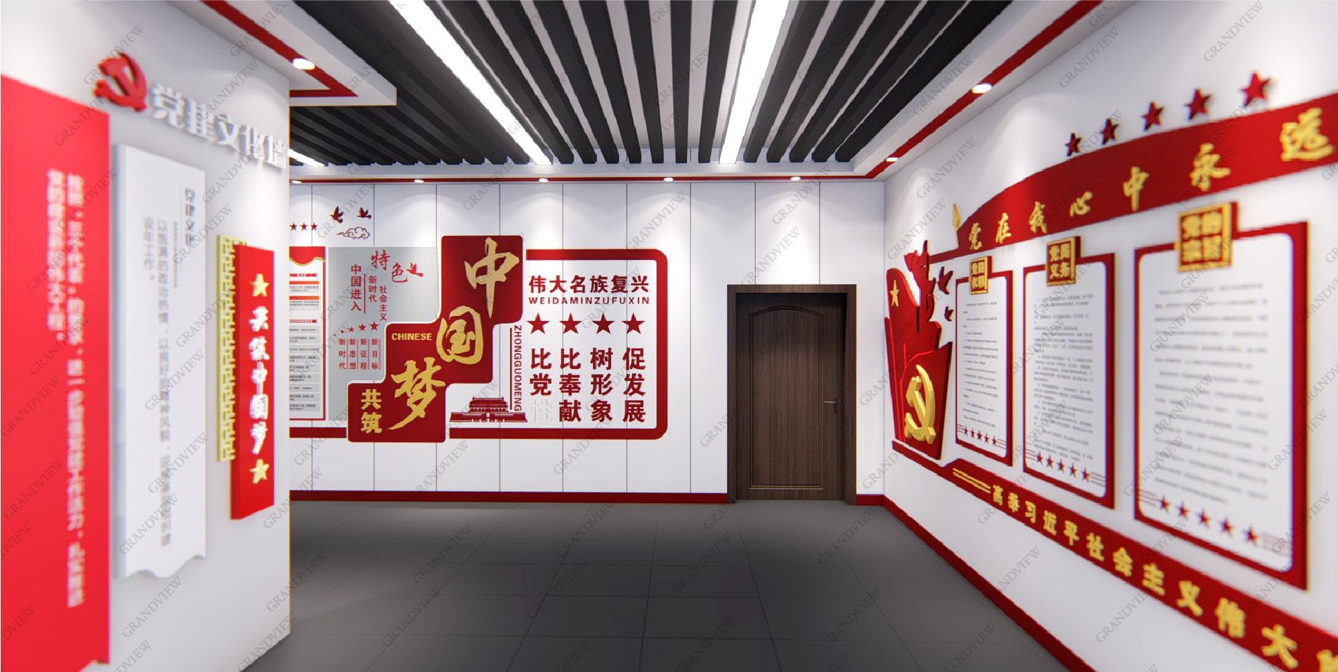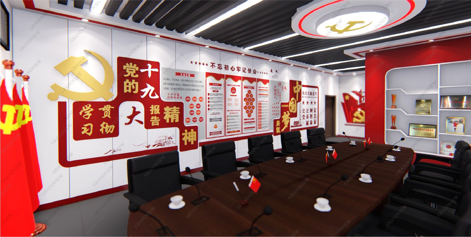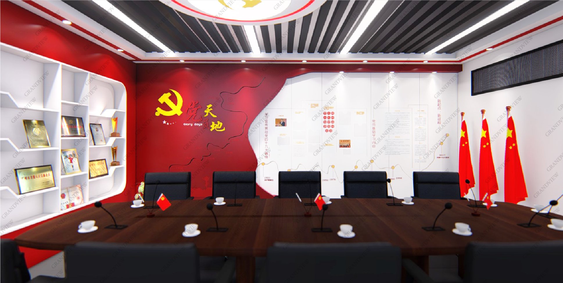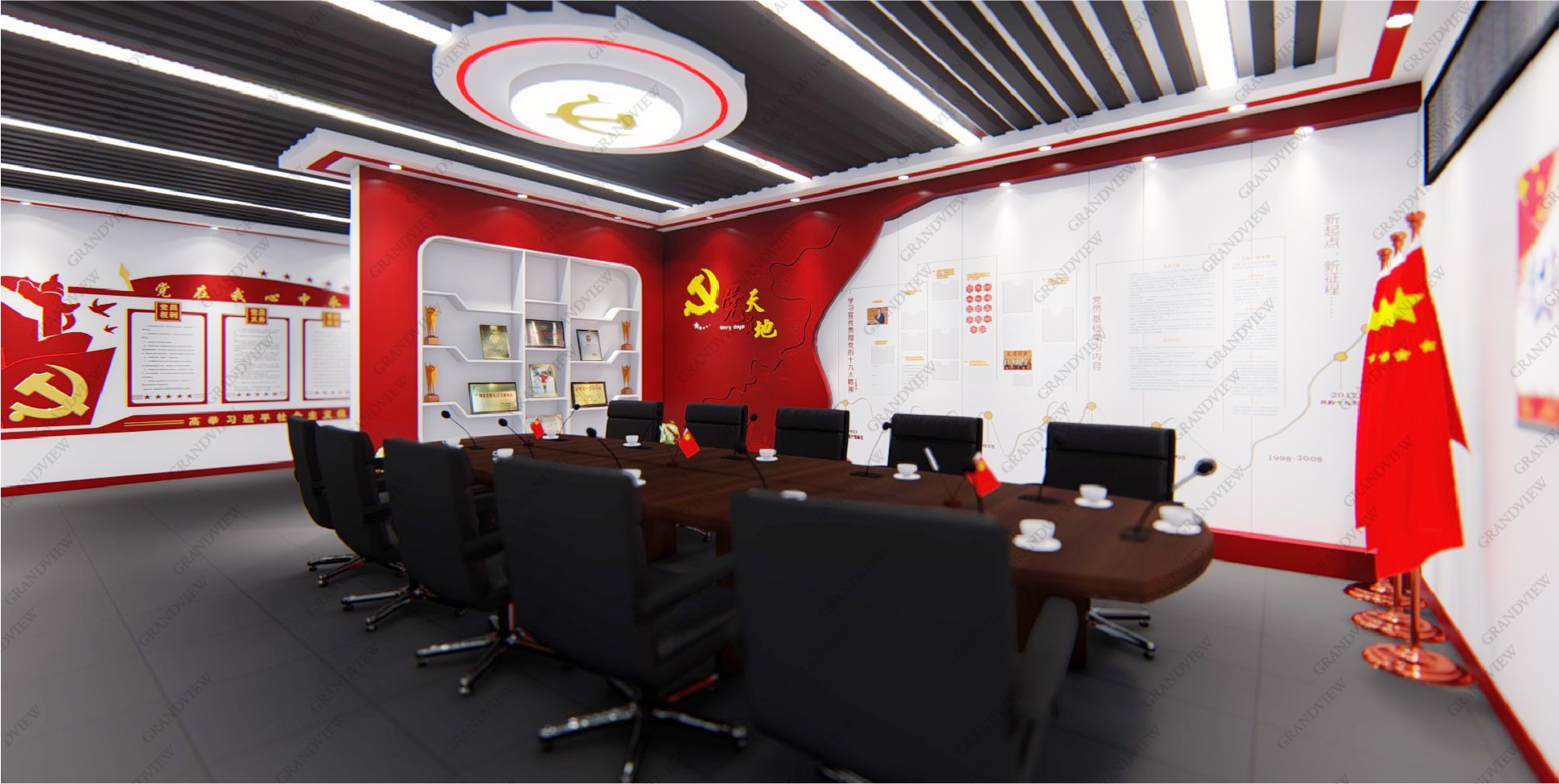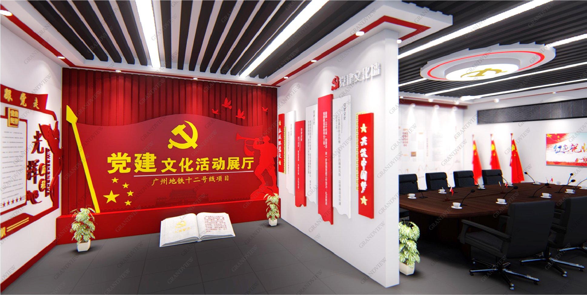 對外,可展示黨的歷程和發(fā)展故事,學(xué)習(xí)黨的精神,感受黨的莊嚴(yán)和神圣;對內(nèi),可進行黨建會議的召開,促進廣州地鐵十二號線的高質(zhì)量發(fā)展,防火的搪瓷鋼板元素的采用與地鐵的實際情況相符,大量紅色元素的應(yīng)用產(chǎn)生強烈的視覺沖擊。